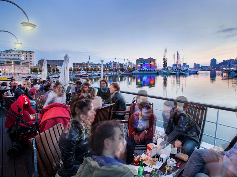 Dietro la grande struttura di Piazza delle Feste, raggiungibile solo tramite una passerella sull’acqua, una grande chiatta galleggiante ospita uno dei locali più animati delle serate estive genovesi.