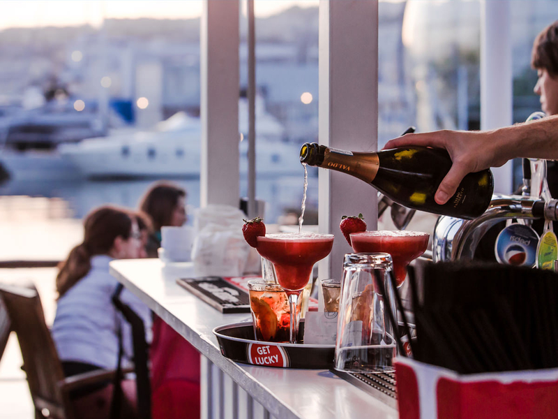 Seduti ai tavolini, sotto grandi ombrelloni bianchi, si ha la sensazione di essere sospesi sull’acqua, proprio al centro del porto.