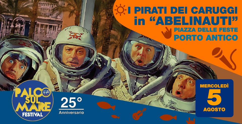 Ultima serata all’insegna delle risate con I Pirati dei Caruggi, il quartetto comico con Alessandro Bianchi, Enrique Balbontin, Fabrizio Casalino e Andrea Ceccon. Presentano in esclusiva per la 25ma edizione di Palco sul Mare Festival lo show inedito dal titolo “Abelinauti”.