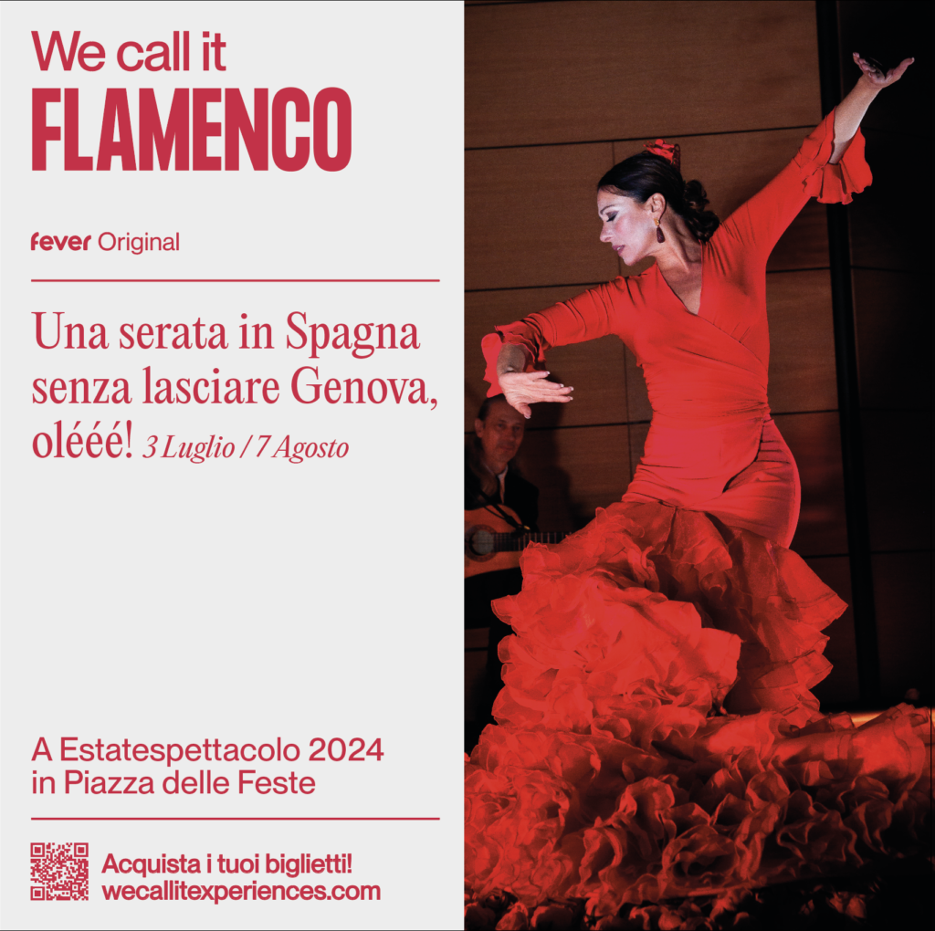 We Call It Flamenco è un’esperienza magica che ti avvolge nella cultura spagnola senza lasciare Genova. Scopri sei dei cinquanta stili di flamenco esistenti (conosciuti come “palos”) eseguiti da artisti professionisti in un suggestivo scenario alla Piazza delle Feste del Porto Antico di Genova! Il 7 agosto saranno proposti due spettacoli in Piazza delle Feste, alle ore 20:30 e alle ore 22:30.