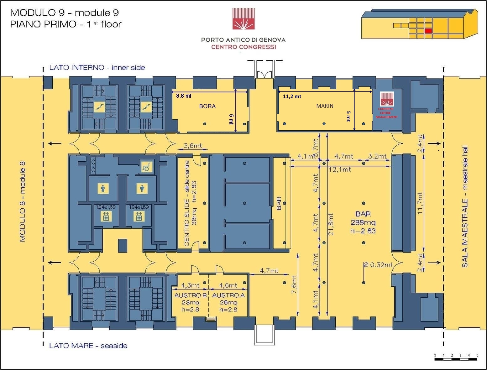 In prossimità della sala principale, sono utili spazi di supporto per le attività organizzative, quali segreteria, sala stampa, lounge relatori. Sono configurabili come punti operativi oppure come sale riunioni sino a 30 posti. La sala Austro è inoltre divisibile in due uffici indipendenti.